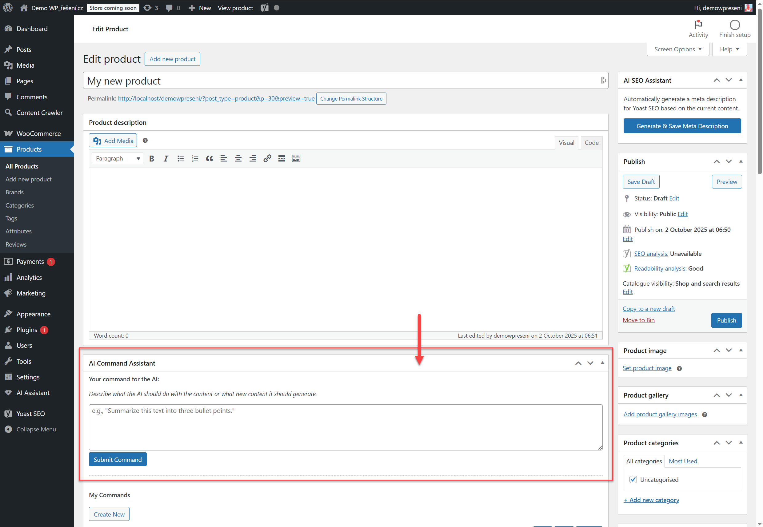 Seamless Integration: Adds the full-featured AI Command Console directly to your WooCommerce product editor.